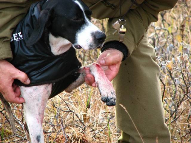 Helt pl�tsligt ser vi hur pointern Silverforsens Lolas v�nster framben st�r rakt ut i en vinkel som inte normalt ska finnas. Efter n�gra steg f�r hon benet �terigen i r�tt l�ge och hon forts�tter upp f�r branten. Men d� kommer nog sm�rtan och hon v�nder p� tre ben mot husse Jan Harald Edvinsen. Det ser ut att g�ra riktigt ont.