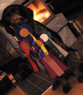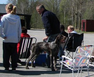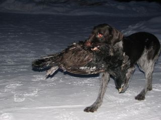 Vid provdagens slut var det dags f�r kastapporter f�r oss fyra i gruppen som g�tt till pris. En ripa hade vi att anv�nda oss av. Vi var sist i turordningen. Det som inte fick h�nda h�nde. Hunden f�re oss tuggade ripan s�nder och samman. Domaren var i valet och kvalet p� hur han skulle g�ra. Vi fick k�ra p� den k�ttslamsade f�geln. Pirri pirri. Gira som �r trygg i apporten fixade pristagarnas snyggaste kastapport p� slamset. Alltid n�got!