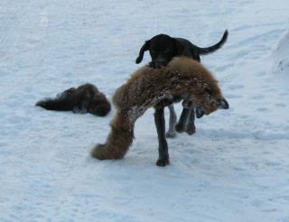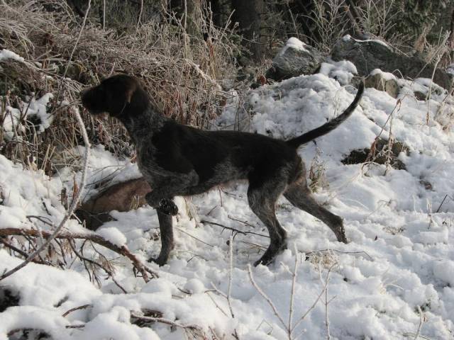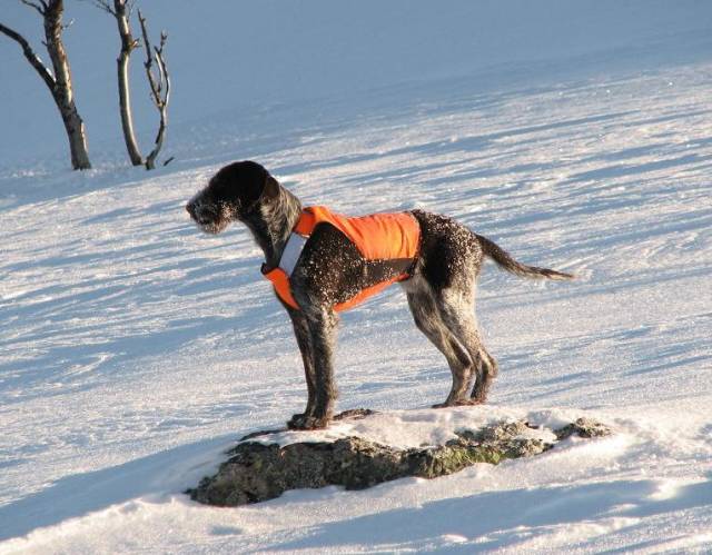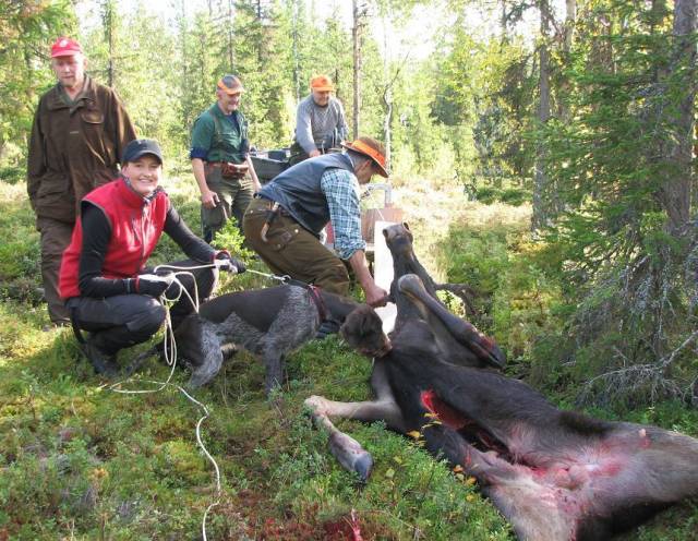 Direkt efter �ker jag till veterin�ren f�r att utesluta infektion. Alla prover var bra och diagnosen till orkesl�sheten blir skendr�ktighet eftersom hennes juver �r fulla av mj�lk. R�det �r �kad motion och minskad m�ngd mat. Hur l�tt �r det med en jakthund under full jakt? Jag g�r ett f�rs�k d�r hon skadar tre av fyra tassar och m�ste vila. Efter ett par tre veckor �r hon i full g�ng och springer som ett jehu p� Junkarri. Jag fattar ingenting.