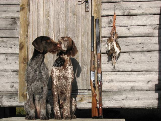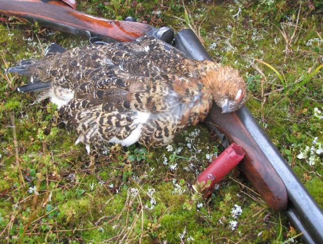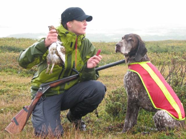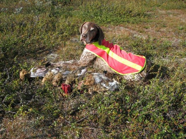 Trots uselt v�der med horisontellt regn lyckades hannapanna skjuta sin f�rsta ripa som "riktig" j�gare. Eftersom unga Gira blivit sjuk i kennelhosta blev gamla Atlas intensivdrillad p� v�ra fasaner och rappisar ca tv� veckor innan jakten. Detta gav resultat. Atlas st�r f�r f�gel, �r lugn i flog och apporterar varm ripa helt felfritt. Pricken �ver i:et �r att jag nu har en b�ssa som passar s� jag tr�ffar det jag skjuter p�. Det kan inte bli b�ttre! =Gl�djet�rar