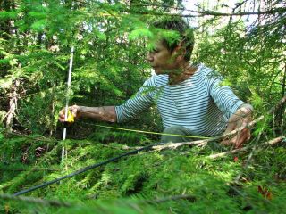 H�r �r det Stefan som drar en lina l�ngs ett snittslat sp�r s� att vi h�ller koll p� linjen. Den �r viktig f�r ett statistiskt s�kert resultat av praktisk ripinventering.