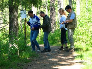P� eftermiddagen var det dags f�r lite praktisk inventeringstr�ning. Vi skulle dela in oss i grupper och utmed en linje leta gula fl�rtkulor som l�g p� marken i skogen.